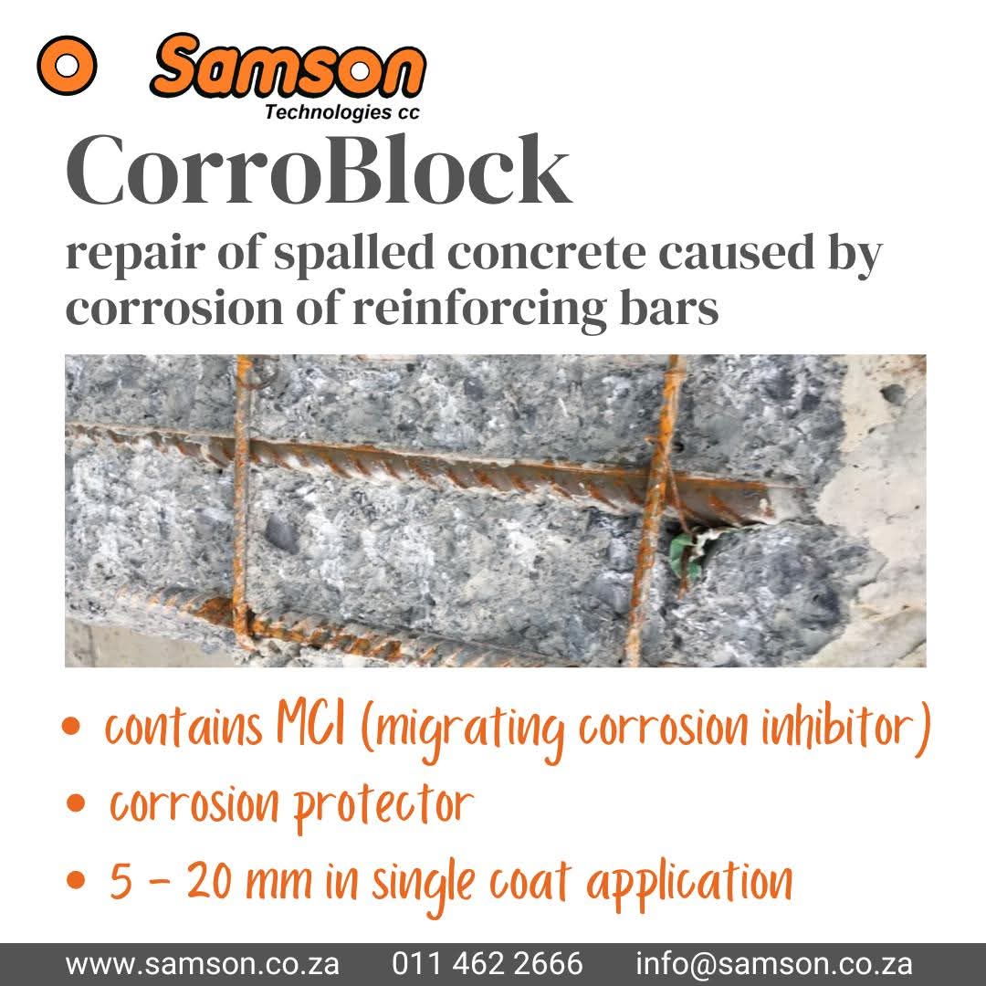 CorroBlock produces a repair mortar by addition of water only. The corrosion inhibition characteristics are promoted by the hydroxide binding characteristics of secondary cementitious materials and the prevention of corrosion promoting ions being carried through the mortar by water.