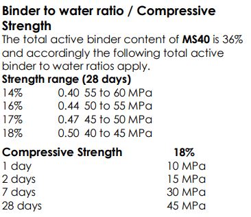 MS40 contains very clean specially graded quartz aggregate (maximum particle size 1400 um) combined with a blend of Cem I 52.5, Cem II 32.5, binders and specialised chemicals and minerals. The composition when mixed with water, produces a fluid flow grout for tortuous path filling of base plates, bolt holes, keyways and the like where limited access precludes plastic packing.